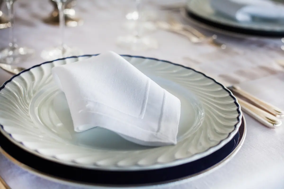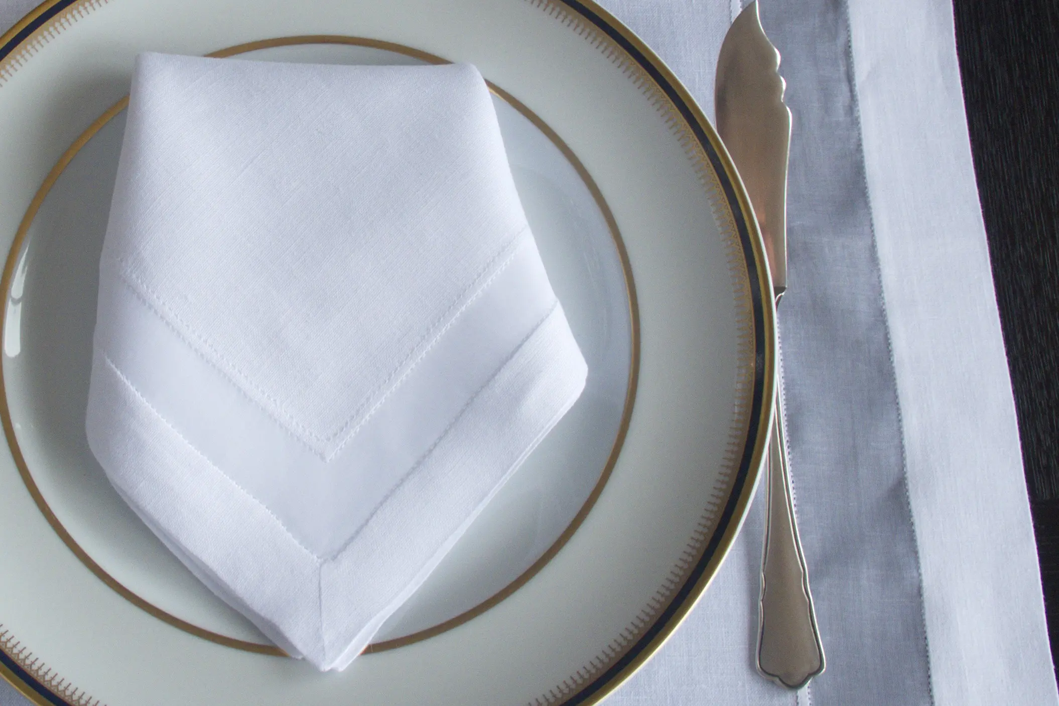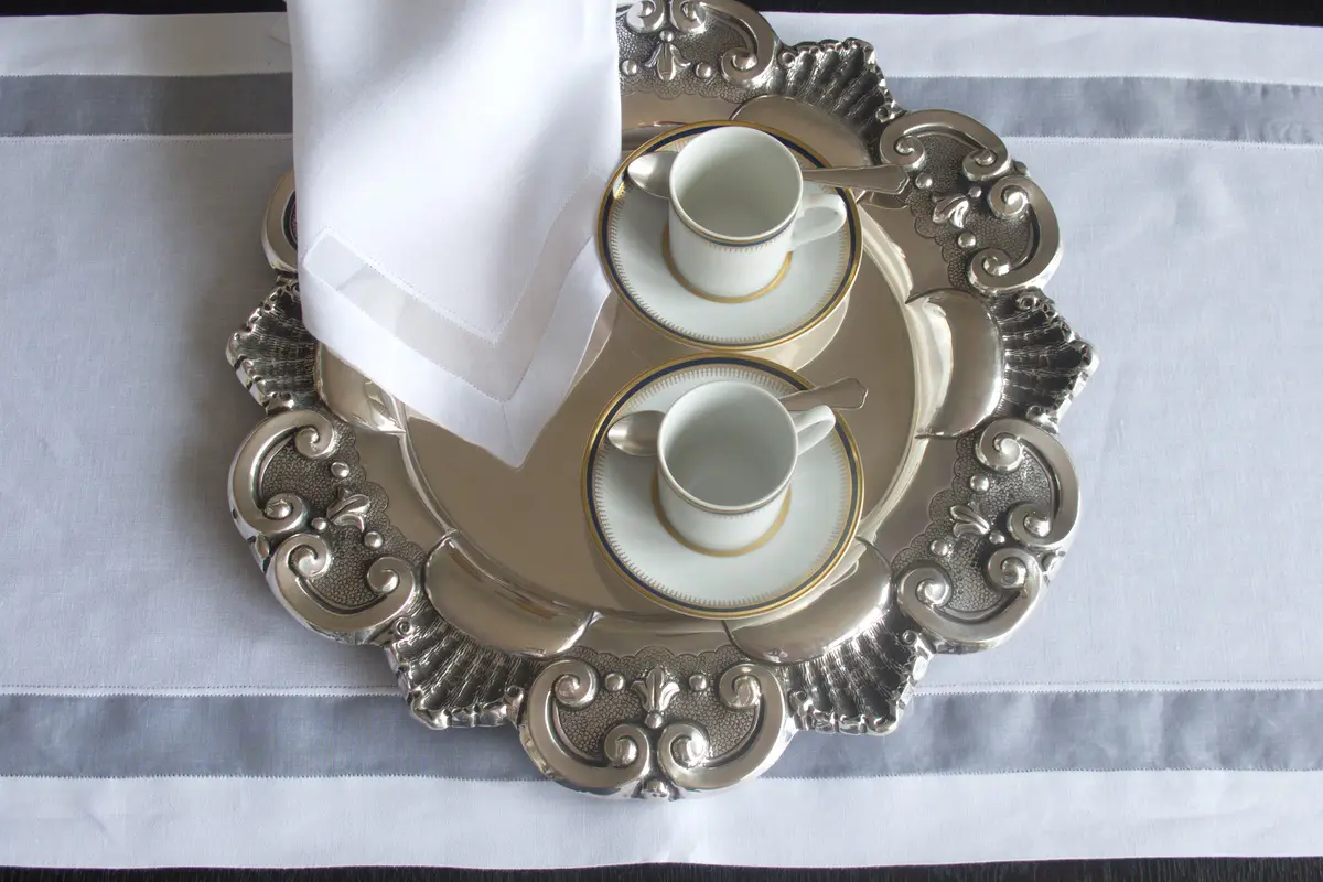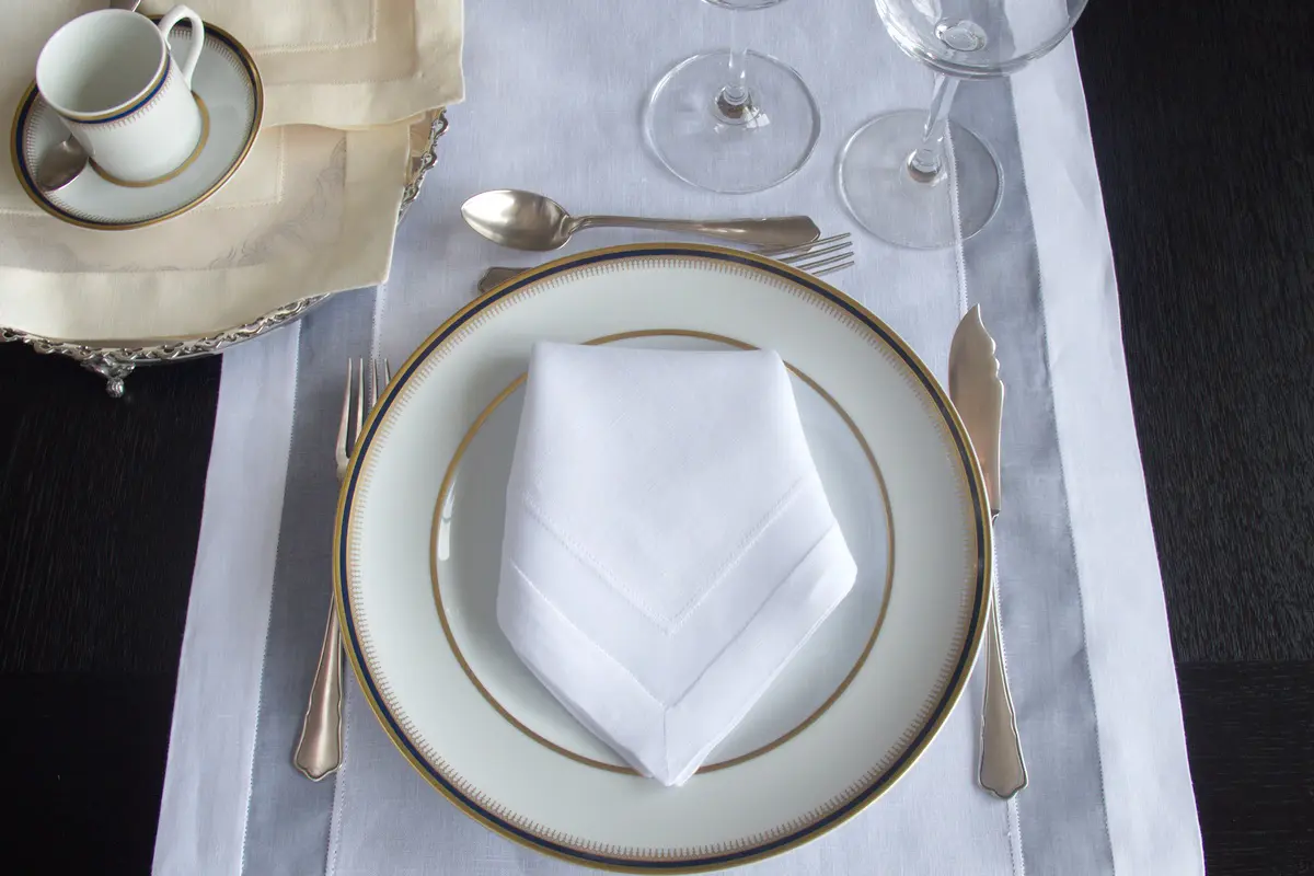 Individuais, guardanapos e centros de mesa em linho e organdy bordados à mão com ponto francês.