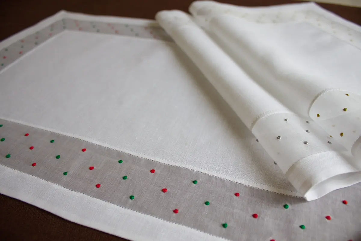 Individuais, guardanapos e centros de mesa de Natal em linho e organdy bordado com garanitos e ponto francês.