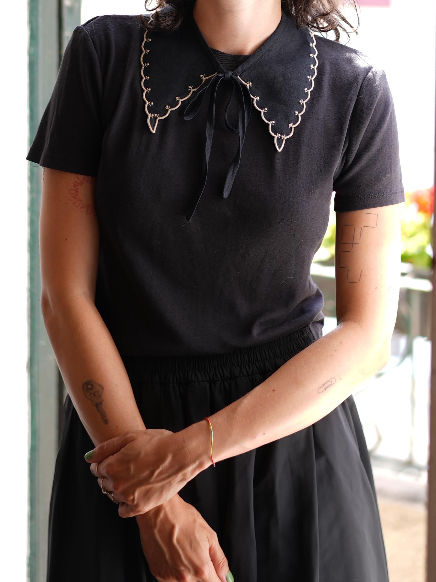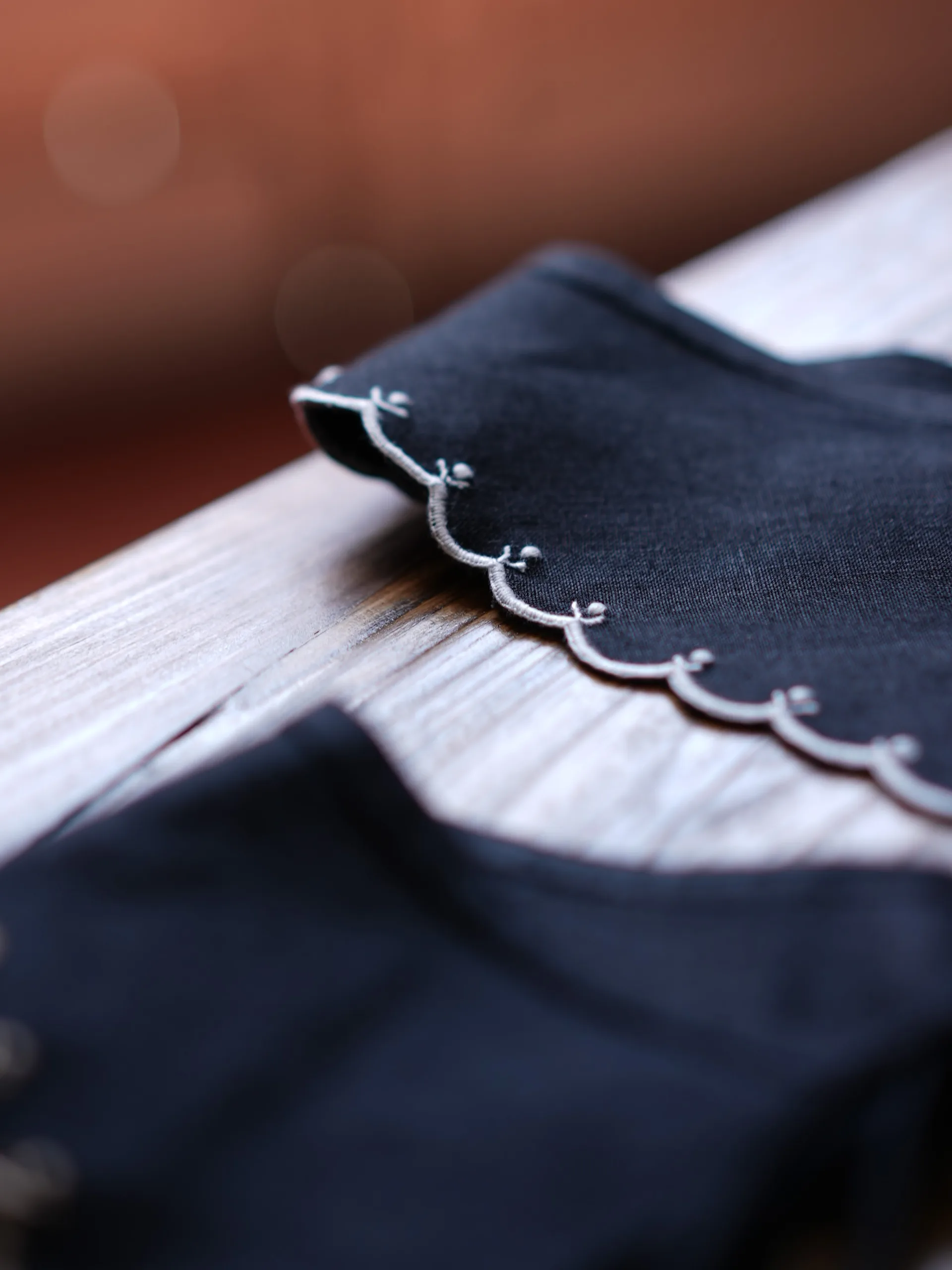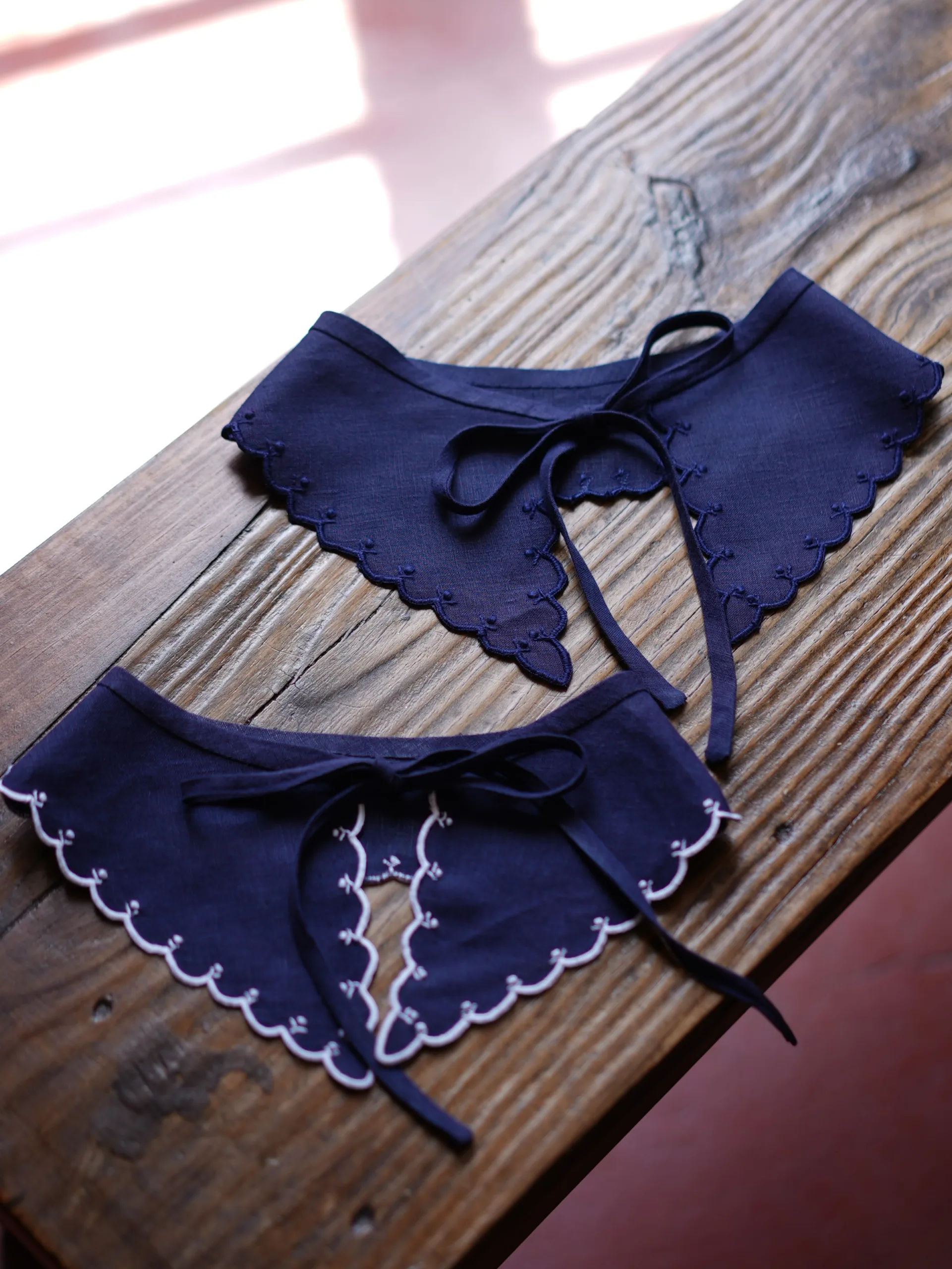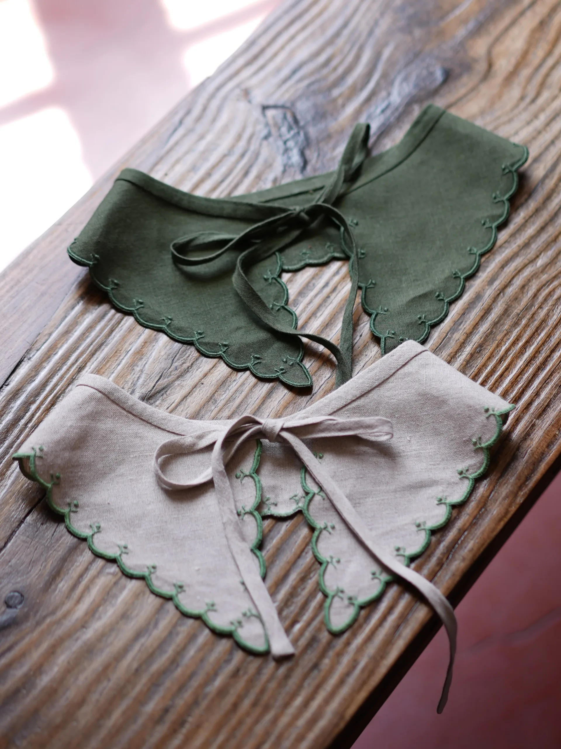 Gola em linho com autêntico Bordado Madeira manual (Ref 337). Trabalho primoroso em granitos, ponto corda e acabamento em caseado. Um acessório intemporal e sofisticado com certificação de origem.